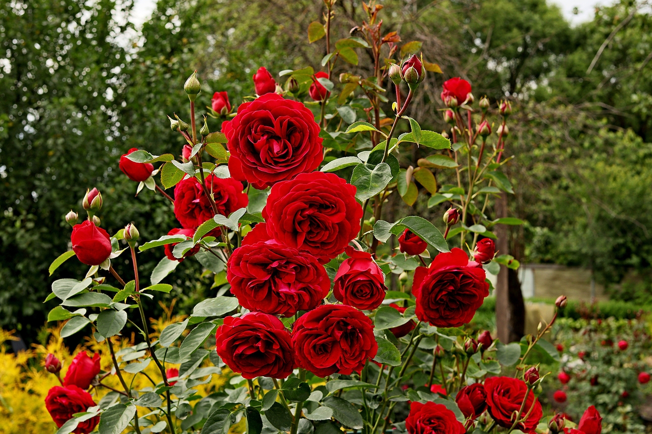 Русская роза, грандифлора, cорт 'Олимджон', (OLIMDZHON, USY1702651), Россия, 2020. Бутоны округлые, слегка заострённые, распускаются медленно. Цветы красные с примесью граната, с тёмным, чёрно-бархатистым отливом, диаметр в роспуске до 14 см., высота бокала до 4 см. Соцветия в основном одиночные, от 1 до 4-х, махровые 70-80 лп., сердцевина закрытая с одиночно ярко жёлтыми тычинками, пробивающиеся сквозь лепестки, края лепестков волнистые, с небольшим шипом в центре, запах слабый. Листва густая, зелёная, полу-глянцевая. Шипы редкие. Кусты прямые, мало раскидистые, высотой до 150 см, шириной 70 см. Цветение продолжительное, повторное; с июня до морозов. Хорошая устойчивость цветов солнцу, дождю и грибным заболеваниям.